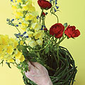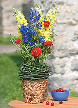 Egyszerű, kerti virágokból is alkothatunk különleges csokrot. A fonott kaspóba állított élénk színű virágok a nádszálakból kanyarított gallérral a legkisebb erkélyen vagy az étkező asztalán is egy teljes nyári pompájában illatozó virágoskert képzetét keltik.