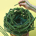 2. A nádszálak egyik végét szúrjuk a tűzőhabba. A nádszálat törjük, hajlítsuk meg több helyen, és a másik végét a tűzőhabba bújtatva rögzítsük. Ezt ismételjük, amíg elkészül a csokrot körülölelő gallérrész.