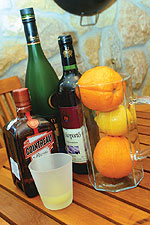 4. A másikat héjastul vágjuk apró darabokra, és tegyük a kancsóba. A kancsót fedjük le fóliával, és tálalás előtt 3-4 órát pihentessük a hűtőben. Kínálás előtt a sangriát még felönthetjük egy kis ásványvízzel.