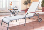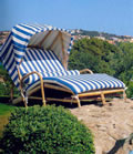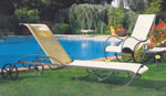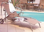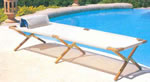Modernebb napozóágy könnyű alumínium vázzal, high-tech hangvételben, fa karfákkal, s természetesen kényelmes ülőfelülettel. E szürkére hangolt példány olyan dinamikus vonalvezetésű, fiatalos és energikus, hogy már-már attól kell tartanunk, ha nem nézünk oda, magától elindul.