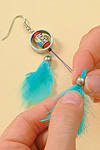 A tollakat, ha szükséges, vágjuk a megfelelő méretre, majd egy kis pillanatragasztóval rögzítsük a fémgyöngybe. A kilógó tollvégeket vágjuk le. Az elkészített fülbevalóalapon kilógó fűzőszál végeit dugjuk a fémgyöngybe, amibe a tollakat fűztük, majd ezt is egy kevés pillanatragasztóval rögzítsük, hogy később ne csússzon szét. A teljes száradás után vágjuk le a kilógó fűzőszálakat.