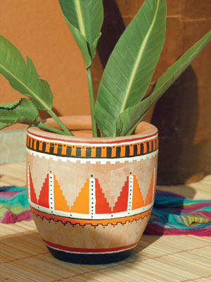 A Praktika magazin szeptemberi számának mellékletben megadott sablon elemeit másoljuk át egy lapra, majd vágjuk ki, helyezzük a kaspóra, és ceruzával halványan rajzoljuk körbe. Használjuk a fantáziánkat: tetszőlegesen variáljuk az elemeket, a csíkok vastagságát, ritmusát változtassuk kedvünk szerint; nincsenek kötöttségek.