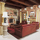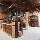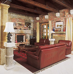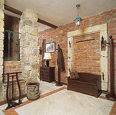 Innen hát a belső tér patinás, semmihez sem hasonlítható, ódon hangulata. A belépőt hatalmas, egymásba olvadó terekből álló nem is lakó-, hanem inkább élettér fogadja. Izgalmas, egyedi rendszert alkotva összefügg a tágas előszoba, a közlekedőfolyosó, a felső szintre vezető lépcső és az óriás méretű nappali-étkező-konyha, mely szervesen kapcsolódik a fedett teraszhoz és a kerthez. A vakolatlan, nyers téglafalak egyébként hetven centi vastagok , a homokkő tartóoszlopok, az egykori magtár kőkonzolai s a dupla fedélszék szabadon hagyott gerendái és deszkázata utánozhatatlan hangulatot árasztanak.