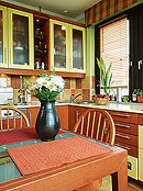 A káposztásmegyeri a lakótelepek sorában az utolsók között épült meg. A telep széle egyben Budapest határa, ahol az egyik sokemeletes épület hatodik szintjén, hetvenhárom négyzetméteren él a négytagú család. Már az ajtónyitás után meglepődünk, hiszen az egyemberes, szűk előszoba helyett tágas térbe jutunk, melynek ablakai a Gödöllői dombságra néznek. A tájkép után a sugárzó, élénk színek ragadják meg a tekintetet. Terrakotta és zöld uralják az előszobával egybenyitott nappalit és étkezős konyhát, mely a családi beszélgetések, étkezések és a vendégfogadások helye.