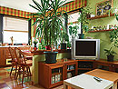 Az így megnyitott előszoba egyébként dolgozóként is funkcionál, mivel nagyszerűen elfér itt a számítógépasztal és tartozékai. A majdnem plafonig érő beépített szekrényekbe szinte minden holmi befér, sőt akad olyan, ami még üresen várja, hogy megpakolják. A most már valóban szobaméretű előteret csupán egy jelképes, boltívvel tagolt fal választja el a konyha-étkező-nappali hármasától. Itt áll a vendéghívogató kanapé, mögötte egy gipszkartonból épített polc, a kanapéról pedig egyenesen a konyharészbe látunk, de néhány lépésnyire van az étkezősarok is. A rengeteg zöld növénynek, a hatalmas ablakoknak és a lenyűgöző panorámának köszönhetően akár verandának is kinevezhetnénk ezt a helyet.