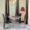 Erre rímel a nappalitérrel egybefüggő étkezőben elhelyezett állólámpa égőpiros ernyője. No meg a modern formájú, ám a kényelmet sem nélkülöző, fémvázas, kárpitos székek lendületes vonalvezetése a szintén fémlábú, üveglapos, nagy kerek asztal körül melynek méltó párja az íves-szögletes alacsony dohányzóasztalka a nappaliban.