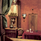 Az enteriőr alaptónusát a piros szín világosabb és sötétebb árnyalatai adják: tűzpiros selyemterítő,