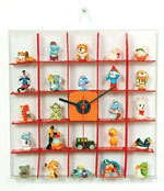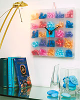Ha túl apró díszítőanyagot használunk, könynyen átfolyhat egyik rekeszből a másikba. Ez megelőzhető, ha a rácsszerkezetet ragasztópisztollyal rögzítjük a helyére. Ha nehezebb figurákkal akarjuk megtölteni az órát, a belső rekeszt vastagabb kartonból készítsük, és fessük tetszőleges színűre. A játékokat kétoldalú ragasztóval rögzítsük a polcocskákra. A jelöléseket ceruzával készítsük a műanyaglap sima oldalára, így azokat utólag le tudjuk radírozni. A fényes felületű fóliához alkoholos filcet használjunk.