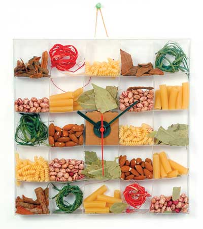 Az óraszerkezetre ragasszunk öntapadó fóliát. A test középső 30×30 cm-es négyzetének középpontjába vágjunk 1 cm-es kört. Ezen bújtassuk át a szerkezetet, és állítsuk össze az alkatrészeit. A D oldalba vágjunk két kis lyukat az akasztónak. Helyezzük a rácsot a négyzetre, és töltsük fel a rekeszeket a díszítőanyagokkal. Bújtassuk egymásba a záróelemeket (A-B-C-d sorrendben), és rögzítsük egy kis darab ragasztószalaggal.