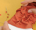 Ehhez a különleges rámához nem kell mást tennünk, mint gyûrni, ráncolni és gombostûzni a lágy esésû, fényes anyagot. A pasztellszínû selyem, gyöngyházfényû flitterrel romantikus, de készíthetjük más anyagból is.