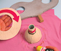 A palackokat a képen látható módon vágjuk szét: az egyiknek hagyjuk meg a száját, de többet vágjunk le belőle alul, míg a másiknak vágjuk le a tetejét, és alul hagyjuk 4-5 cm-rel hoszszabbra segítségül előbb jelöljük be filctollal. Ez utóbbit vagdossuk be körben a belehelyezett másik pa-lack aljáig, és hajtogassuk ki a füleket. A kivágott szájú palack alá helyezzük azt, amelyiknek meghagytuk a száját. A triplex kartonból vágjunk ki egy 18 cm átmérőjű kört. A fehér filcből vágjuk ki a szabásminta alapján a kört, a bevagdosott téglalapot és a csíkot, a rózsaszínűből a nyilat és a keskeny csíkot. A mellékletben található sablon alapján hullámkartonból vágjunk ki 6 kulcsformát.