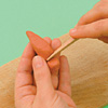 A gyurmából csípjünk le egy tenyérnyi darabot, és először formázzuk meg a két cipőt. Mintázófa segítségével alakítsuk ki a cipősarkokat. (Az éppen nem használt vagy maradék gyurmát tegyük nejlonzacskóba, vagy tekerjük be folpackkal, mert hamar kiszárad.)