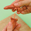 A cipőbe fúrjunk egy kis lyukat, majd ebben helyezzünk el egy aprócska gyurmát. Szúrjunk egy fogpiszkálót a nadrágszárba, majd tűzzük a végére a cipőt. A részek így nem fognak letörni száradás után. A lábakat helyezzük egymás mellé, s nyomjuk rá a műanyag támaszra, hogy felvegyék annak formáját. Ez a stabil rögzítéshez
