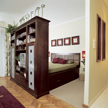 Legelőször is a szűk előszobát és a miniatűr konyhát elválasztó falat tüntették gyorsan el, majd sor került a lakószobát elkülönítő fal egy részére is. Így alakult ki az előtér-konyha-étkező funkcióit ellátó lakrész, és ettől némiképpen elválasztva a nappali és háló egysége. Utóbbit fal helyett két oldalról használható, térben álló, egyedi tervezésű szekrény különíti el a társalgótól úgy, hogy közben a térérzet, a levegősség hatása megmarad.
