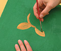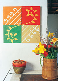 Másolópapírra rajzoljuk át, majd vágjuk ki a mellékletben található motívumot. A mintát a 4 negyedből álló kép 2-2 kockájára, elforgatva fogjuk felrajzolni. Miután az alapfestés megszáradt, helyezzük egymás mellé a piros és zöld, illetve a narancs és okker lapokat, majd ceruzával rajzoljuk körbe a min-tát az egyik, illetve a másik irányból. A piros és zöld négyzeteken fessük a mintát aranyra, a narancs és okker képeken pedig dolgozzunk fehér akrillal.