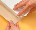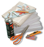 A molinódarabokat egyenként fújjuk le ragasztóval, és helyezzük rájuk a hungarocell-lapokat. Az oldalakra simítsuk rá a textilt úgy, hogy a vágott vég alá hajtsuk be a szomszédos oldal kinyúló fülecskéit. Ha körbeértünk, simítsuk a hátoldalra a kilógó anyagot. Hagyjuk rövid ideig száradni.