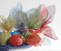 Az organzába burkolt festett tojások nemcsak asztaldíszként pezsdítik fel a hagyományos ünnepi terítést, de szeretteinket is meglephetjük egy-egy ilyen kedves kis ajándékkal.