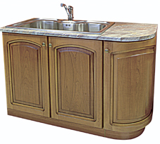 Közepes méretű konyhába illik a diófa borítású alsó szekrény, melybe jól elfér a dupla mosogatótálca csöpögtetővel, sőt igény szerint a tűzhely is beépíthető. Ötletes megoldás ilyenkor a szekrény ívelt végződése, ahova a kisebb konyhai kellékek helyezhetők. Semleges színű, márványos felületű lapot válasszunk hozzá, és régies, akár vidékies