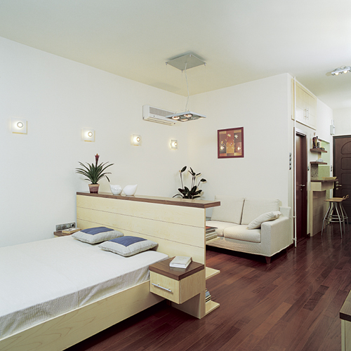 A szobát egy könyvszekrényként funkcionáló, jelképes válaszfal osztja nappali-társalgóra és hálóra. A csaphornyos, diószínűre pácolt parketta kontrasztos, ám nem harsány tónusú tárgyakat kíván….