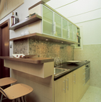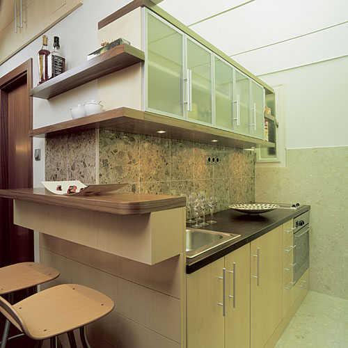 Korábban az egyes helyiségeket falak és ajtók határolták, melyeket a tervező az átalakítás során kibontatott, egybenyíló, tágas területet biztosítva ezáltal a különböző funkcióknak. A négyzetméterek számát ettől még nem sikerült megnövelni, de a tér levegőssé, átláthatóvá vált. A bejárattól balra a beépített szekrényt és a tévészekrényt helyezték el, jobbra a konyha és a fürdőszoba találhatók. Méreteit meghazudtolva a közlekedőre nyíló konyhában minden elfér: munkapult, tűzhely, mosogató, sőt szekrények és polcok formájában rakodó- és tárolófelület is gazdagítja a berendezést. Az egykori bejárat helyére kétszemélyes étkezőpult került. A konyhabútorok a Holzwood Kft. műhelyében készültek.