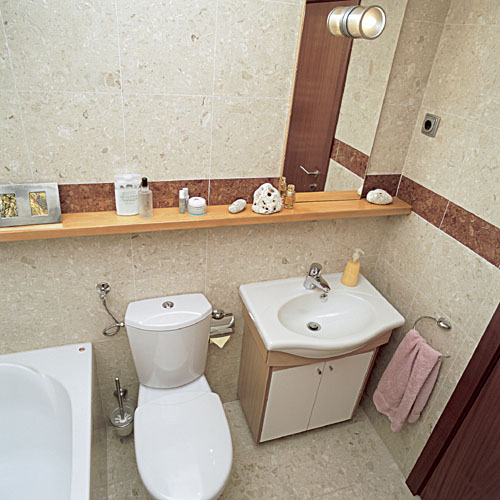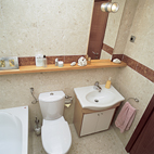 A kicsiny fürdőben minden megtalálható, ami nélkülözhetetlen. A szekrényre szerelt mosdókagyló helytakarékos megoldás, a nagyméretű tükör pedig trükkösen nagyítja a helyiséget. A konyhából már ismerős mészkő burkolat szerves kapcsolatot teremt a fallal, ajtóval elkülönített fürdő és a nyitott konyha között.