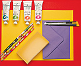 A nyomdázáshoz használhatunk hagyományos pecséttintát is, bár sokkal színesebb kompozíciókat készíthetünk, ha temperával dolgozunk. A szivacsot fektessük egy lapos tányérra, kissé vizezzük be, és tegyünk rá temperapöttyöket. A radírokat nyomjuk a festékes szivacsba, de ne kerüljön túl sok festék a pecsétnyomókra, mert akkor könnyen elmaszatolódik a papíron a nyomat.