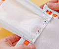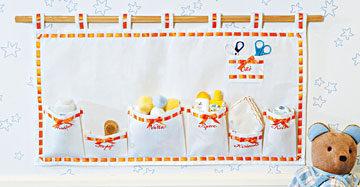A zsebekbe tegyük be a feliratok alá a kartonpapírt, és vékony ecsettel először vízzel hígítva, halványan, majd sűrűbb textilfestékkel fessük át a szavakat. Hagyjuk megszáradni, majd az esetleg még látható ceruzanyomokat radírozzuk ki. Vágjunk a szaténszalagból 20 cm-es darabokat és hajtsunk belőlük masnikat. Cérnával húzzuk össze a közepüket, és egy-egy szem gyöngyöt is odaöltve varrjuk a zsebekre. Az ollótartó masniját a falvédőhöz is varrjuk jól hozzá, ez az öltés tartja meg majd az ollót.