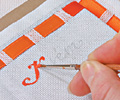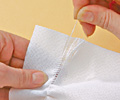 A zsebek felső szélét, az ollótartó alsó és felsô szélét, valamint az akasztók mindkét hosszanti oldalát hajtsuk be kétszer a fonák oldalra és bújtatott öltések-kel varrjuk le a szegélyt. A biztosítótűvel a szaténszalagot húzzuk be az előzőleg kihúzott szálak helyére: 1,5 cm látszódjon a szalagból, 0,5 cm a megmaradt szövetszálakból, s ezt ismételgessük. Tisztázzuk el a szegetlen széleket.