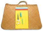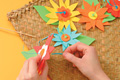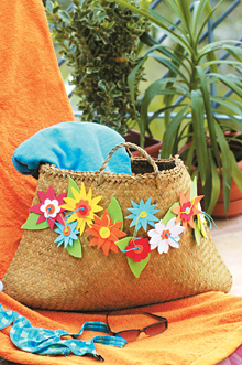Vágjunk az akrilszálból körülbelül 15 cm-es darabokat, és fűzzük át őket a szalmatáska oldalán, belülről kifelé, a fonatok résein. A hegyes hurkapálcával fúrjunk két lyukat a virágfejek közepébe, és fűzzünk két-három sziromréteget és egy virágközepet a zsinór két végére. Végül kössünk rá egy csomót. A táska szélét így díszítsük végig a színes, nagyfejű virágokkal.