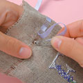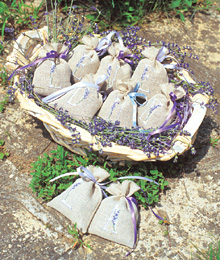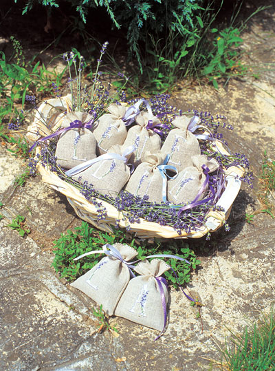 A hímzés után a zsák két lapját színükkel fektessük egymásra, a száját kivéve varrjuk össze, majd tisztázzuk el. Fordítsuk ki és vasaljuk le. Húzzunk ki az anyagból néhány szálat, és oda fűzzük be a szaténszalagot. Töltsük meg levendulavirággal a zsákot, és kössünk rá masnit.