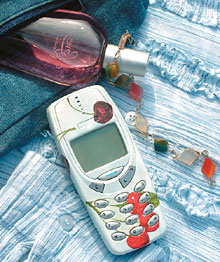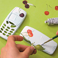 Vágjuk ki a cseresznyéket a szalvétából, és húzzuk le a legfelső mintás réteget. Állítsuk össze a tokot üresen, és tervezzük meg a minták elrendezését. Kenjünk fel egy réteg ragasztólakkot a telefonra, helyezzük rá a kivágott motívumot, és középről kifelé simítsuk a felületére a cseresznyéket. Próbáljuk meg a puha ecsettel a legapróbb ráncokat is eltüntetni. Amikor a lakk már majdnem megszáradt, sniccerrel óvatosan vágjuk el a szalvétát a telefon két oldalának illesztésénél, és vágjuk ki a nyomógombok nyílásait is abban az esetben, ha ezeket is mintákkal díszítettük. Végül kenjük át a tokot még néhány réteg lakkal. Száradás után helyezzük vissza a telefon alkatrészeit.