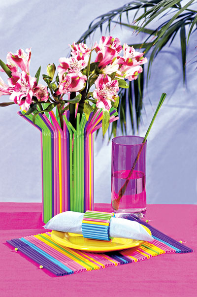 Csupán egy karcsú befőttesüveg, a méretétől függően 40-60 darab szívószál, és megfelelő ragasztó szükséges ennek a nem mindennapi vázának az elkészítéséhez. A ragasztópisztolyos rögzítés jól megtapad az üvegen, és mivel gyorsan szilárdul, művünk percek alatt elkészülhet. Tehetünk kétoldalú ragasztószalagot is az üvegre, az is tökéletesen tartja a díszborítást.