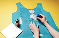 A puffadós festékek és a színes 3D kontúrok csőrös tubusai lehetővé teszik, hogy pár perc alatt szebbnél szebb mintákat rajzoljunk a textíliákra, vagy akár egy kész ruhára is. Húzzunk egyszerű virágmintákat, köröket vagy hullámvonalakat a festékkel, és hagyjuk megszáradni. A festék típusától függően fixáljuk a motívumokat az anyag hátoldaláról vagy az elejéről úgy, hogy 5-10 cm távolságból, vasalóval gőzöljük a festéket.
