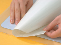 lassan húzva a védőréteget. Fontos, hogy ne maradjon alatta légbuborék. Ha elkészültünk, vágjuk le a kilógó fóliaszéleket, és kerekítsük le az alátét sarkait.