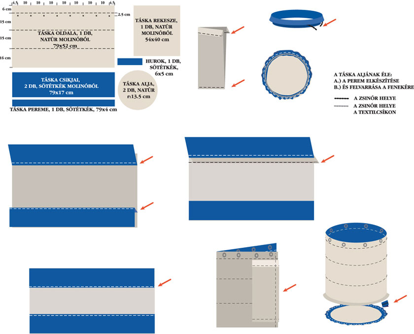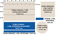 Szabjuk ki a natúrszínű molinóból a táska oldalát, a rekeszt, az alját, a sötétkék molinóból pedig a csíkokat, a peremét és a hurkot.