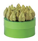 A csörgőfa élénkzöld terméseit egy-egy pötty ragasztóval illesztettük a dobozka tetejére, ami így sündisznóhoz lett hasonló.