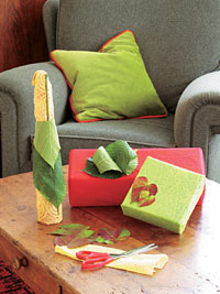 2 – A fikusz fényes, hosszúkás levelei kis csokorba szedve igazán mutatósak. 3 – A szárított levélegyveleg meg is vásárolható: így ilyen dekorációt télen-nyáron készíthetünk. 4 – Széltében vagy hosszában egyaránt feltekerhetjük a színes leveleket. 5 – A natúr dobozt szépen pöndörödő, vörös, száraz levelek díszítik. |