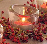 Szintén feldobhatjuk az asztalt, sőt bármelyik sarkot, ha néhány csipkebogyószárat vagy lampionvirágot (más néven zsidócseresznyét) egy pohárba teszünk, körültekerjük színes szalvétával, rafiával sisallal, vagy egyszerű színes szalaggal.