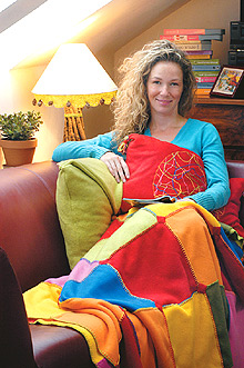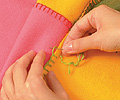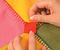 Mivel a poláranyag nem foszlik, a szélek eltisztázására nincs szükség, viszont azért került a varrásvonal a szélektől 1 cm-re, hogy pelenkaöltéssel díszíthessük a varrásráhagyásokat. Először zöld fonallal hímezzük körbe a takarót, a többi színnel pedig vegyesen varrjuk ki a négyzetek színoldalán lévő varrásszélességeket. A másik oldal varrásráhagyásait vágjuk le 2 mm-re a varrásvonallal párhuzamosan.