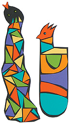 A lap mellékletében található sablon kontúrját másoljuk át fekete kartonra, és vágjuk körbe. Különböző színű öntapadós fóliából vágjunk kisebb-nagyobb háromszögeket, illetve szabálytalan alakzatokat. Segítségképpen használhatjuk a sablonra rajzolt mintázatot, de bízhatunk a fantáziánkban is, hiszen a sok apróra vágott darabkát jó móka elrendezgetni. A szemek helyére aprófejű, csillogó miltonkapcsot nyomjunk.