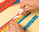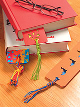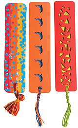 A delfinekkel és geometrikus mintákkal díszített könyvjelzőkhöz vágjunk egy 7×21 cm-es csíkot a színes kartonból, és a hosszanti oldalait, a szélektől 1-1 cm-re vonalzó mellett karcoljuk meg, majd hajtsuk be. A „kis ablakokat” készítsük mintalyukasztóval, vagy vagdossuk ki a különböző formákat sniccerrel. Csúsztassuk a borítótól elütő színű papírcsíkot (4,8×21 cm) a behajtott szélek alá, és a könyvjelző hátoldalán átlátszó ragasztószalaggal ragasszuk le ezeket teljes hosszukban. Befejezésül készítsünk egy-egy lyukat a könyvjelzők aljába, üssünk a lyukakba színes ringlit, és ezekbe fűzzünk bojtot vagy csak néhány szál tarka fonalat. A pöttyös könyvjelző alapja egy 5×21 cm-es kartoncsík. Erre ragasszuk az iratlyukasztóval kilyuggatott színespapír-csíkokat. A szélső papírcsíkokat hagyjuk kicsit túllógni a kartonon, hajtsuk alá, majd ragasszuk le.