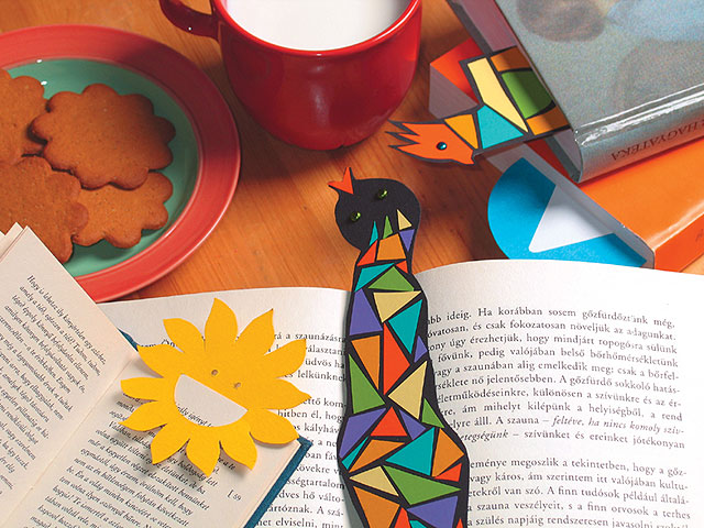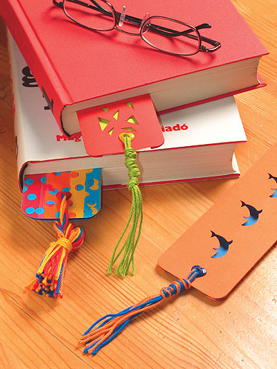 A delfinekkel és geometrikus mintákkal díszített könyvjelzőkhöz vágjunk egy 7×21 cm-es csíkot a színes kartonból, és a hosszanti oldalait, a szélektől 1-1 cm-re vonalzó mellett karcoljuk meg, majd hajtsuk be. A „kis ablakokat” készítsük mintalyukasztóval, vagy vagdossuk ki a különböző formákat sniccerrel. Csúsztassuk a borítótól elütő színű papírcsíkot (4,8×21 cm) a behajtott szélek alá, és a könyvjelző hátoldalán átlátszó ragasztószalaggal ragasszuk le ezeket teljes hosszukban. Befejezésül készítsünk egy-egy lyukat a könyvjelzők aljába, üssünk a lyukakba színes ringlit, és ezekbe fűzzünk bojtot vagy csak néhány szál tarka fonalat. A pöttyös könyvjelző alapja egy 5×21 cm-es kartoncsík. Erre ragasszuk az iratlyukasztóval kilyuggatott színespapír-csíkokat. A szélső papírcsíkokat hagyjuk kicsit túllógni a kartonon, hajtsuk alá, majd ragasszuk le.