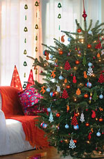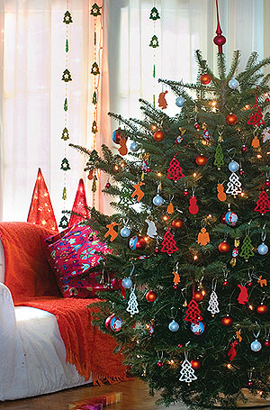 Az idei szezonban új anyagok is megjelentek: a toll és a filc. Emellett elmaradhatatlanok a csillogó üvegdíszek, az izzósor és a szaloncukor.