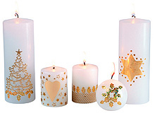Leggyorsabb a díszítés a változatos mintázatú kontúrmatricákkal. Az arany kontúrok fehér gyertyán mutatnak a legszebben. Kombináljuk arany viaszlapokkal vagy hologramos matricákkal, süteményes kiszúróformákkal „kiszaggatott” motívumokkal.