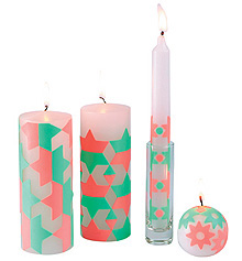 A csillagformát variálva és két, egymástól elütő színű viaszlapot kombinálva színes kompozíciókat alkothatunk. A csillagokat felezzük el sniccerrel, vagy nyomjuk félig a formát a viaszlap szélére úgy, hogy a csúcsok összeérjenek. Így a leeső kis háromszögeket is felhasználhatjuk. A kisebb csillagból szívószállal emeljük ki a belsejét.