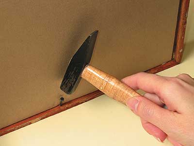 Helyezzük rá az üveglapot, és így, együttesen tegyük a rámába a lapokat, majd a hátoldaláról üssünk apró szögeket a keret szélébe, hogy beszorítsuk a kartont és az üveget a helyére. (Ha szükséges, előzőleg csiszoljuk le és fessük át a keretet.)