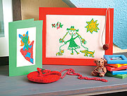A képhez vágjunk a kartonpapírból és a vatelinből akkora darabot, amekkora a keret hátsó kivágásába illik. A kartonra feszítsük rá a képet (mérete körben 2 cm-rel nagyobb legyen a kartonnál) úgy, hogy közé tesszük a vatelint, majd ragasszuk a karton hátoldalára a ráhajló vásznat. Tegyük a képet a keretbe. A képeslaphoz színes kartonpapírba vágjunk a képnek megfelelő formájú és nagyságú ablakot, ragasszuk mögé a képet, majd a hátoldalára ragasszunk egy fehér papírlapot, hogy eltakarjuk vele a kép hátoldalát.