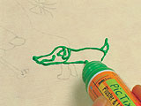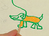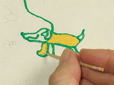 A rajzok apró részleteit úgy tudjuk a festékkel szépen kitölteni, ha a kifestendő felület közepébe egy kis festékpöttyöt nyomunk, majd egy fogvájóval a krémes állagú festéket a szélekhez, a sarkokba húzzuk. Színeket is tudunk keverni ezzel a módszerrel: két színből nyomjunk egymás mellé egy-egy pöttyöt, és a fogpiszkálóval húzzuk össze.