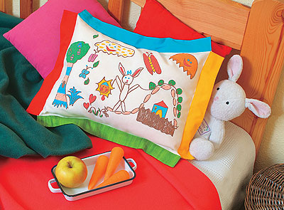 A gyerekrajzról készítsünk erős rajzolatú fénymásolatot (állítsuk sötétre a gép tónusát); szükség szerint nagyítsuk, illetve kicsinyítsük a kívánt méretre. Tegyük a rajzra a vászondarabot, amelynek hátoldalára celluxszal ragasszuk fel a papírt, nehogy elmozduljon. Ceruzával rajzoljuk fel a vászonra a papírról átlátszó vonalakat. Vastagabb vászon esetében ezt a műveletet az ablak üvegén, nappal végezzük, hogy a fény átvilágítsa a textilt. A színes festék el fogja takarni a ceruzavonalakat, ezért bátran rajzolhatunk az anyagra.