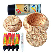 Fújjuk le feketére a rostkosarat. Tömjünk újságpapírt a belsejébe, mert így a festék nem hatol át az apró réseken, és belül megőrizhetjük természetes, világos színét. A kosár külsejét, valamint a fedelet felülről több rétegben fújjukle az akrilspray-vel. Hogy egyenletes legyen a színezés, száradás után fordítsuk meg a kosarat, és az alját is fessük meg. (Az újságpapírt csak a festés befejezése után vegyük ki, hogy megőrizzük a kosár belsejének világos színét.)